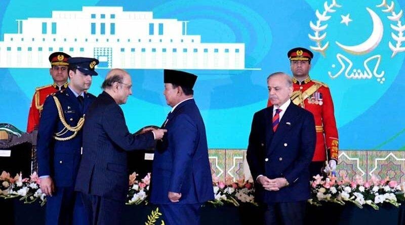 اسلام آباد (پی کے نیوز)ایوانِ صدر میں منعقد ہونے والی ایک پروقار تقریب میں صدرِ پاکستان آصف علی زرداری نے پاکستان کے دورے پر موجود انڈونیشیا کے صدر پرابوو سوبیانتو کو ملک کے اعلیٰ ترین سول اعزاز ’نشانِ پاکستان‘ سے نوازا۔ تقریب میں وزیراعظم شہباز شریف، چیئرمین سینیٹ یوسف رضا گیلانی، اسپیکر قومی اسمبلی ایاز صادق اور اعلیٰ عسکری حکام نے شرکت کی۔اعزاز کی تقریب کے بعد دونوں صدور کے درمیان ملاقات ہوئی، جس میں پاکستان اور انڈونیشیا کے تاریخی تعلقات، باہمی تعاون اور مستقبل کی شراکت داری کو مزید مضبوط بنانے پر اتفاق کیا گیا۔ رہنماؤں نے امن و استحکام، علاقائی ترقی اور عالمی سطح پر مشترکہ اہداف کے لیے تعاون بڑھانے کی ضرورت پر زور دیا۔